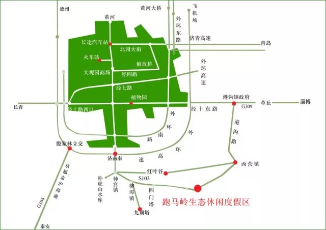由濟南繞城高速濟南南出口下,沿103省道南行至柳埠大橋,沿左側道路行駛到達李家塘,左轉前行到達跑馬嶺生態(tài)休閑度假區。