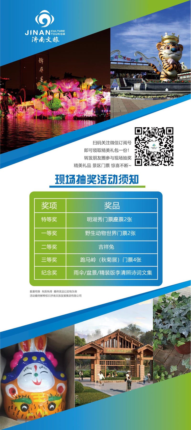 展會(huì )現場(chǎng)的抽獎活動(dòng)最是誘人,通過(guò)掃描集團訂閱號二維碼即可領(lǐng)取精美禮包一份,轉發(fā)朋友圈,參與現場(chǎng)抽獎活動(dòng),獎品有明湖秀觀(guān)演坐票、濟南野生動(dòng)物世界門(mén)票、吉祥兔、跑馬嶺(秋菊展)門(mén)票、定制雨傘、盆景、精裝版李清照詩(shī)詞文集等,好禮多多,等您來(lái)!