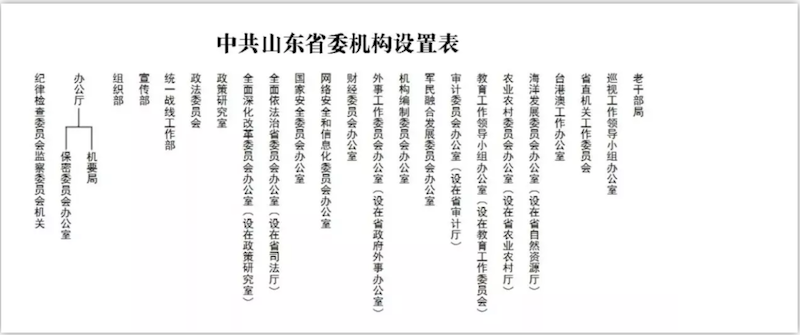 中共山東省委設置紀檢監察機關(guān)1個(gè),計入機構限額的工作機關(guān)15個(gè)(設在相關(guān)部門(mén)的省委議事協(xié)調機構的辦事機構不計入機構限額)。其中,紀律檢查委員會(huì )與監察委員會(huì )合署辦公,實(shí)行一套工作機構、兩個(gè)機關(guān)名稱(chēng);辦公廳掛省檔案局牌子;組織部掛省公務(wù)員局牌子;宣傳部掛省新聞出版局、省版權局、省政府新聞辦公室、省精神文明建設委員會(huì )辦公室、省電影局牌子;統一戰線(xiàn)工作部掛省政府僑務(wù)辦公室牌子;臺港澳工作辦公室掛省政府臺港澳事務(wù)辦公室牌子;網(wǎng)絡(luò )安全和信息化委員會(huì )辦公室掛省互聯(lián)網(wǎng)信息辦公室牌子。教育工作委員會(huì )與省教育廳合署辦公,不計入機構限額。 此外,設置工作機關(guān)管理的機關(guān)2個(gè)。其中,保密委員會(huì )辦公室(省國家保密局)、機要局(省密碼管理局)由辦公廳管理。