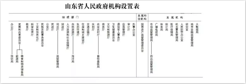 說(shuō)明: 山東省人民政府設置工作部門(mén)35個(gè)。其中,辦公廳和組成部門(mén)24個(gè),直屬特設機構1個(gè),直屬機構10個(gè)。辦公廳掛參事室、口岸辦公室牌子;發(fā)展和改革委員會(huì )掛新舊動(dòng)能轉換綜合試驗區建設辦公室牌子;科學(xué)技術(shù)廳掛外國專(zhuān)家局、黃河三角洲農業(yè)高新技術(shù)產(chǎn)業(yè)示范區管委會(huì )牌子;工業(yè)和信息化廳掛國防科技工業(yè)辦公室牌子;自然資源廳掛林業(yè)局牌子;水利廳掛南水北調工程建設管理局牌子;農業(yè)農村廳掛扶貧開(kāi)發(fā)辦公室牌子;文化和旅游廳掛文物局牌子;衛生健康委員會(huì )掛中醫藥管理局牌子;市場(chǎng)監督管理局掛知識產(chǎn)權局牌子;地方金融監督管理局掛金融工作辦公室牌子。 此外,設置部門(mén)管理機構7個(gè)。其中,信訪(fǎng)局由辦公廳管理;能源局、糧食和物資儲備局由發(fā)展和改革委員會(huì )管理;監獄管理局由司法廳管理;海洋局由自然資源廳管理;畜牧獸醫局由農業(yè)農村廳管理;藥品監督管理局由市場(chǎng)監督管理局管理。