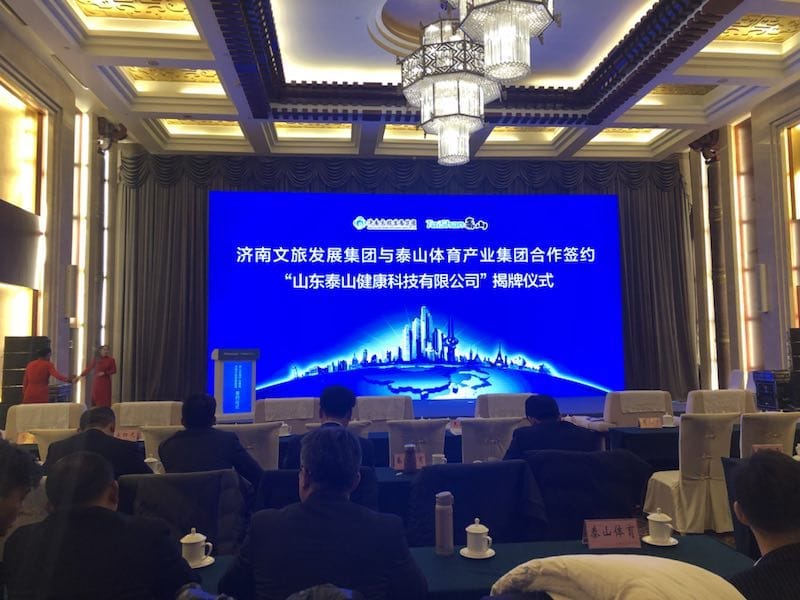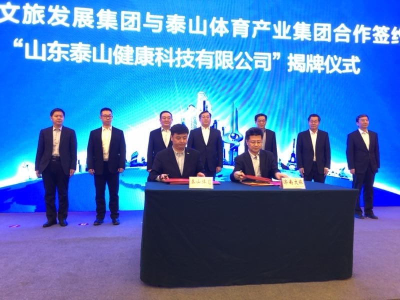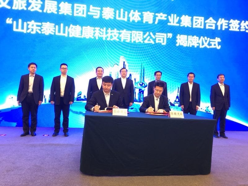 2019年1月1日,新年的第一天,濟南文旅集團與泰山體育集團戰略合作簽約暨“山東泰山健康科技有限公司”揭牌活動(dòng)在舜耕山莊隆重舉行。省委常委、濟南市委書(shū)記王忠林,省體育局局長(cháng)李政,市委常委、秘書(shū)長(cháng)蔣曉光,副市長(cháng)王桂英,副市長(cháng)孫斌參加活動(dòng)。