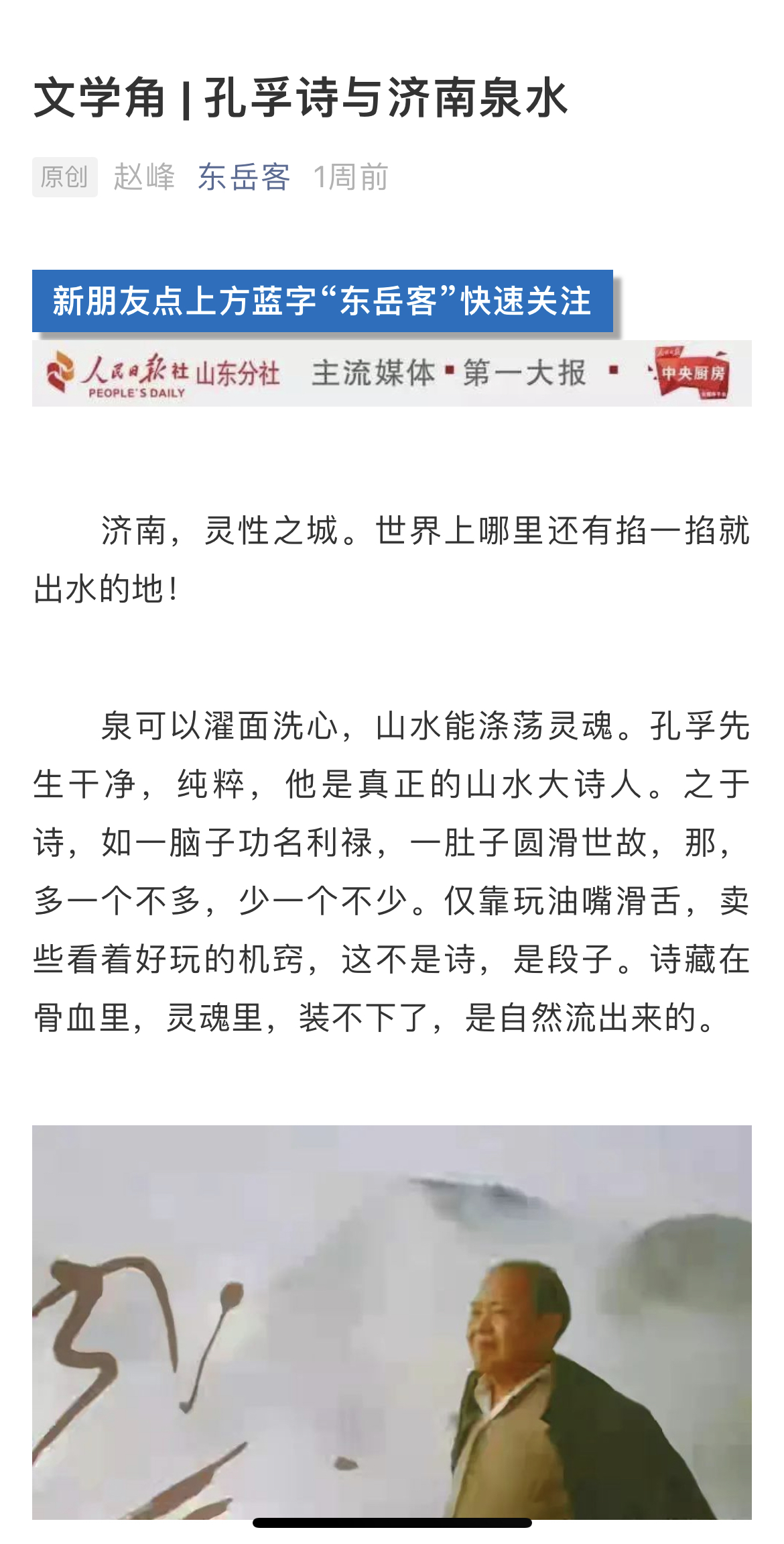 2021年9月5日,“東岳客”以《孔孚詩(shī)與濟南泉水》為題,刊發(fā)趙峰關(guān)于濟南泉水的回憶和思考,如下為報道詳情——