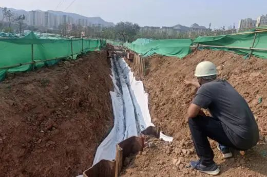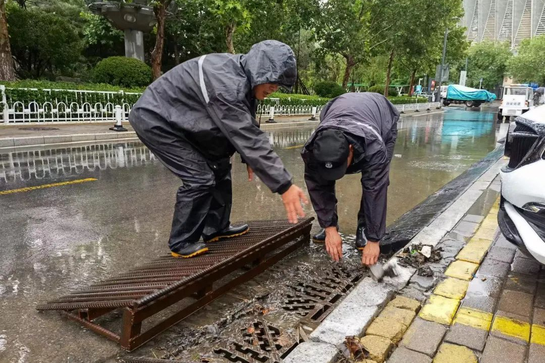 百合園林集團一線(xiàn)工作人員檢查排水溝槽,確保排水通暢