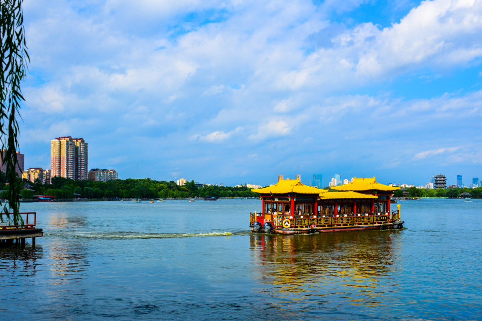 紅色的船身古樸典雅,時(shí)尚大氣,徜徉在大明湖的湖面上,秀美風(fēng)光,讓人感受到兒時(shí)“讓我們蕩起雙槳”的悠閑自在。無(wú)論是選擇觀(guān)光游覽船,還是豪華游舫,都能讓你身臨其境地感受初夏大明湖的詩(shī)情畫(huà)意。