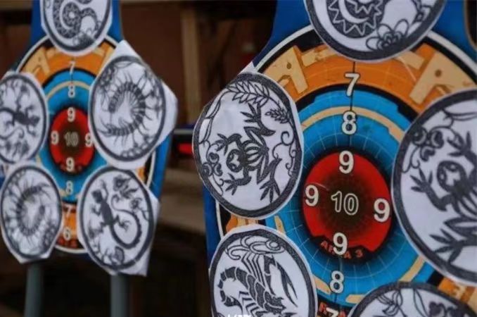 實(shí)彈射擊,參與者打中靶紙上任意一個(gè)“五毒”即可獲贈精美子彈工藝品1個(gè);弓箭射箭,由教官帶領(lǐng)孩子進(jìn)行弓箭射五毒活動(dòng)并講授五毒文化與端午節文化由來(lái)。