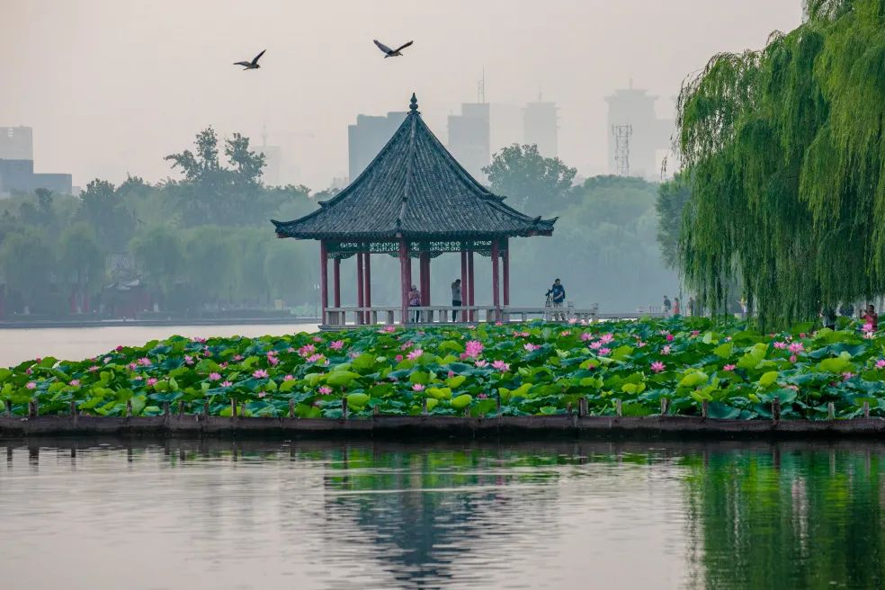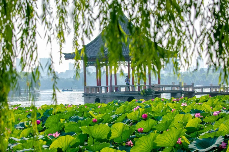 每當盛夏時(shí)節,賞荷觀(guān)柳是市民和游客最?lèi)芤獾男蓍e時(shí)光。荷花是夏花的代表,以“出污泥而不染,濯清漣而不妖”聞名,被譽(yù)為“花中仙子”,是濟南的市花之一。