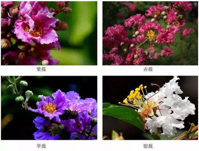 紫薇雖名為“紫薇”,可不僅僅只有紫色。根據花色的不同,紫薇可分為四個(gè)品系:紫薇、翠薇、赤薇、銀薇,顧名思義,花色分別為紫紅、藍紫、火紅、白色。