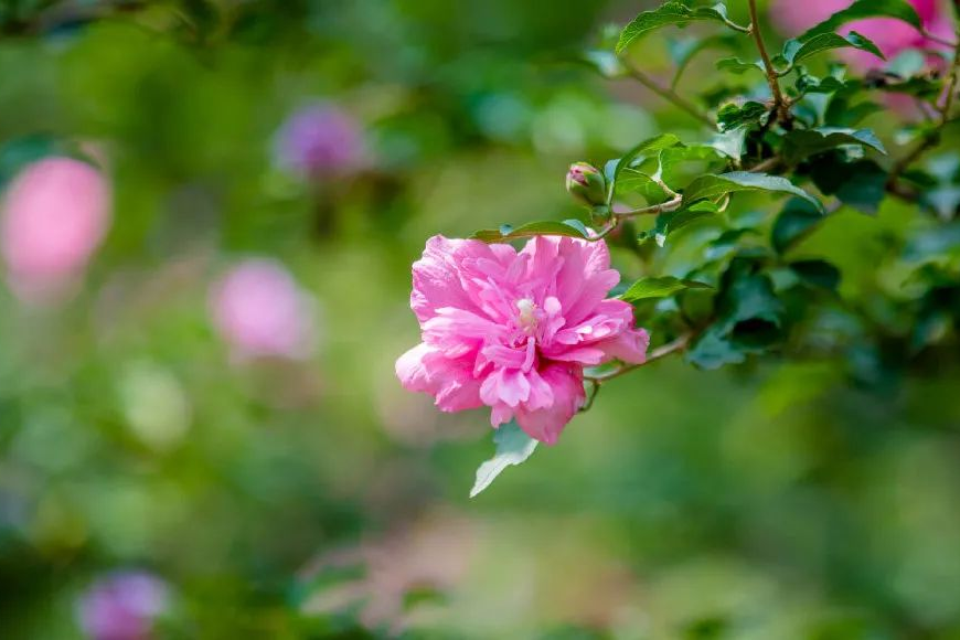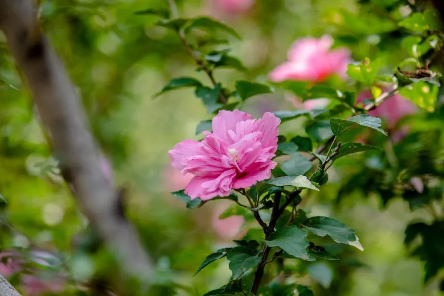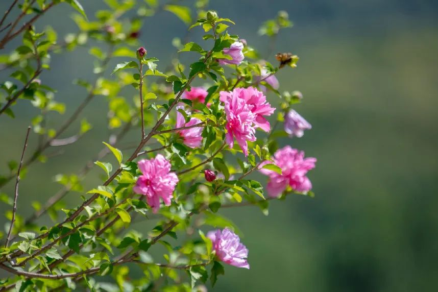 6月中下旬,濟南的木槿花開(kāi)始盛開(kāi),精致艷麗,被茂盛碧綠的葉子襯托著(zhù),分外嬌艷。