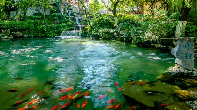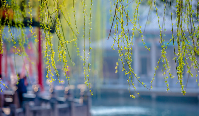 魚(yú)群徜徉清溪,柳影浮動(dòng)泉畔