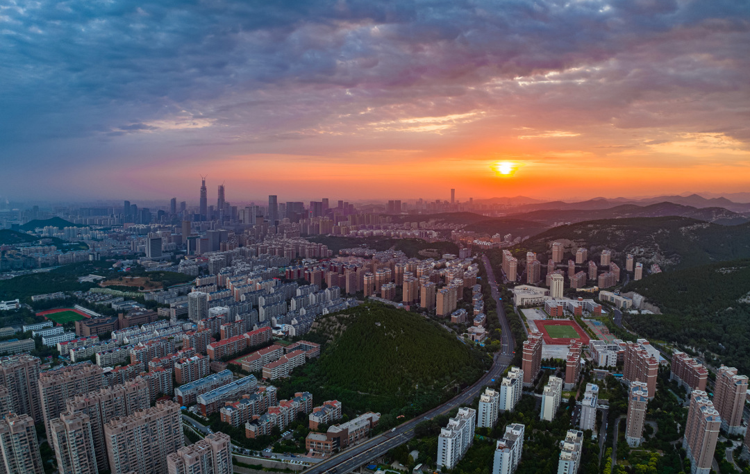 一輪圓日緩緩垂落地平線(xiàn),美不勝收。落日余暉編織成橘子味的晚霞,溫柔又熱烈,如打翻大自然的調色板,絢爛多彩,如夢(mèng)似幻。整座城市都籠罩在金黃的余暉中,美不勝收。