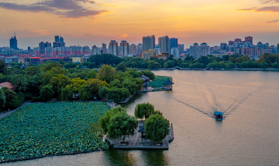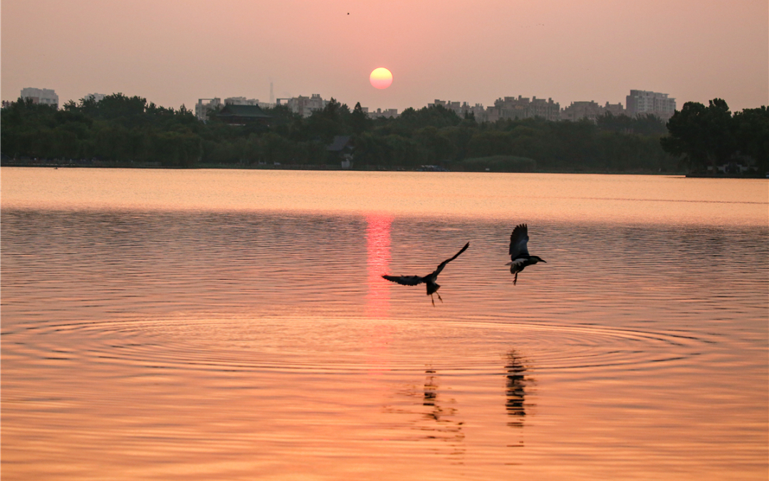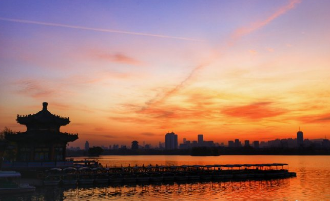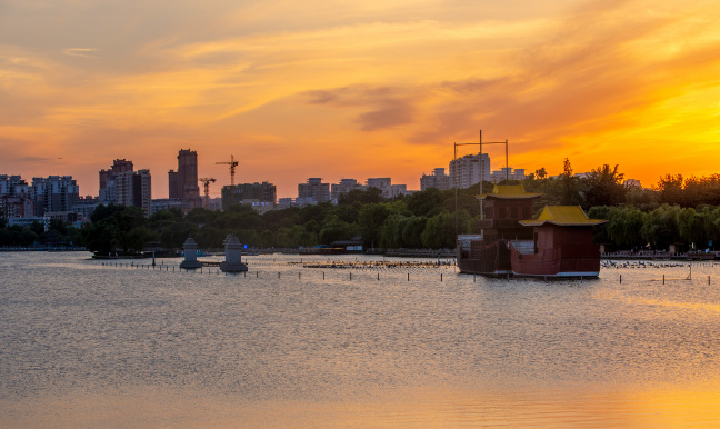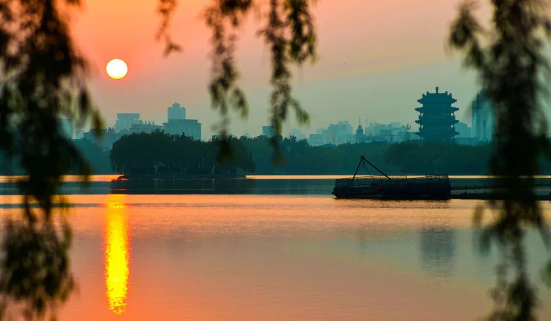 清晨日出前后是大明湖最美的時(shí)刻,太陽(yáng)從東方冉冉升起,天邊開(kāi)始慢慢變紅,朝霞漫撒在湖面上,把湖面染成金黃色,如絲綢般的湖面上波光粼粼,水天一色,耀眼奪目。