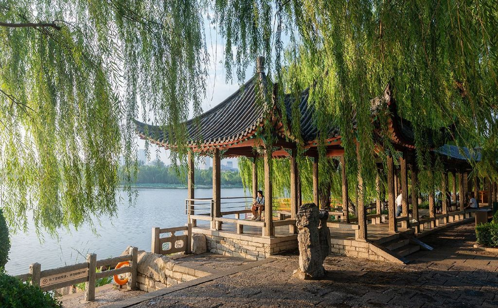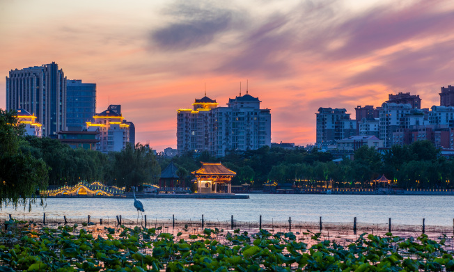傍晚時(shí)分,陽(yáng)光沒(méi)有白天的“威力”,柔美的夕陽(yáng)灑落在大明湖上,呈現出黃色的波光粼粼,湖岸邊的古建筑和城區“染”成了金黃色。如同漫畫(huà)里走出的場(chǎng)景,引得漫步的行人旅客駐足觀(guān)看,走走停停。