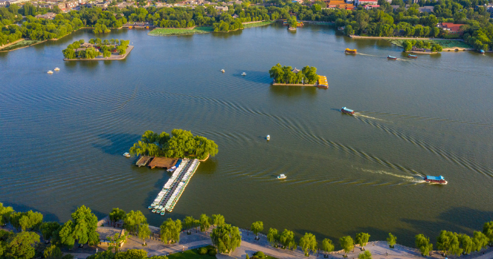 大明湖在藍天的映襯下形成水天一色美景,游客們泛舟湖上感受大明湖的初秋美景,整個(gè)水面與藍天白云交相輝映,如同“天空之鏡”。