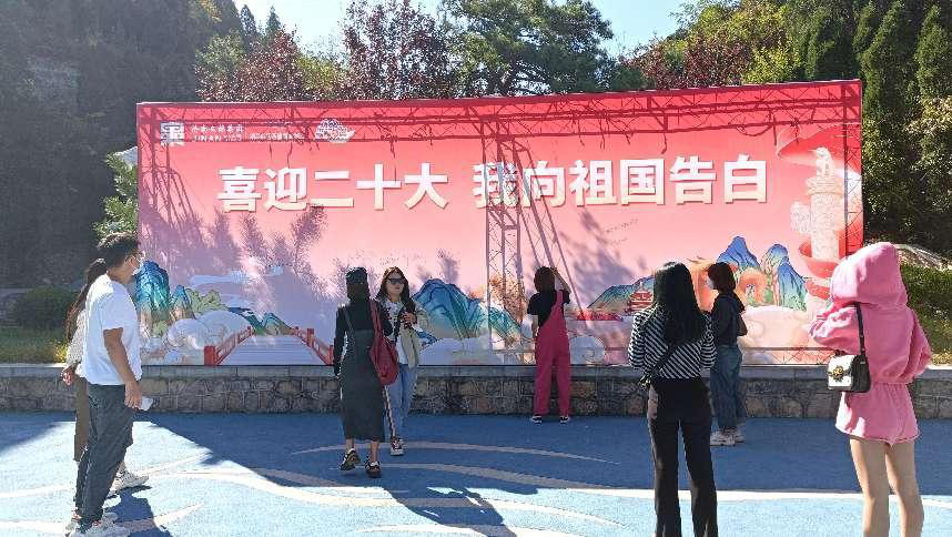 節日期間,跑馬嶺景區入口裝飾了國慶告白幕布,國慶氛圍濃郁,游客朋友們可以在此簽字合影,向祖國告白,留下對祖國最美好的祝愿。