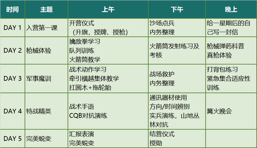 1、五天四夜研學(xué)營(yíng)(軍事訓練)