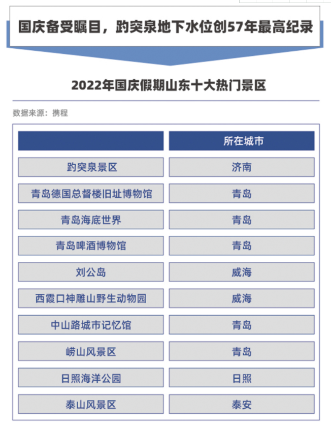 在剛剛過(guò)去的國慶假期,最受矚目的景點(diǎn)在哪里?近日,攜程發(fā)布的“2022年國慶假期山東十大熱門(mén)景區”,濟南趵突泉榮登榜首。