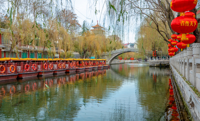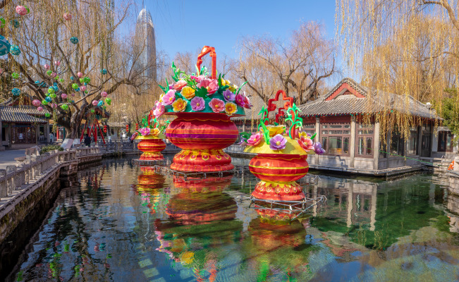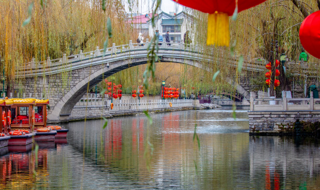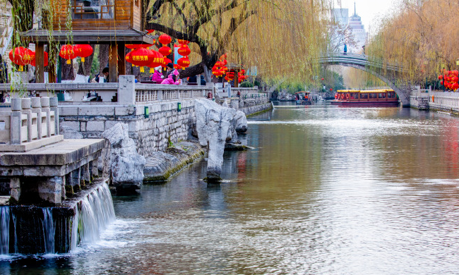 大紅燈籠掛滿(mǎn)河邊,和碧藍的河水構成最美的泉水景觀(guān),營(yíng)造出紅火的節日氣氛。尤其是當夜幕降臨,泉水、彩燈、燈籠交相輝映,把景區裝點(diǎn)得五彩斑斕。