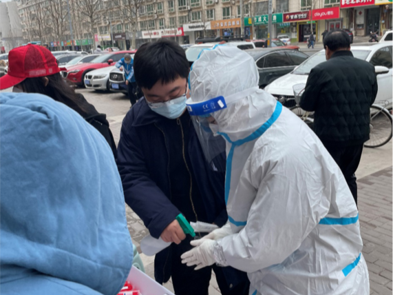 在全民核酸期間,袁方正除了負責組織核酸檢測以外,還要幫助采樣的社區醫務(wù)工作者進(jìn)行手消,這也是他印象最深刻的一件工作。“每采樣一次,我就需要給他們的手部噴灑酒精進(jìn)行消毒,一天下來(lái),光我們這一個(gè)檢測點(diǎn)就要進(jìn)行850次采樣,所以至少就要幫助醫務(wù)工作者進(jìn)行850次手消。三月陰雨綿綿,正好趕上降溫,本來(lái)他們的手長(cháng)期在戶(hù)外已經(jīng)凍的沒(méi)有知覺(jué)了,還要再用酒精消毒,很多醫務(wù)工作者最后連防護服也脫不下來(lái),可想而知他們的手有多難受。他們一站就是一天,只保持固定的核酸采樣的動(dòng)作,面罩上的哈氣也非常影響視線(xiàn),但是他們沒(méi)有一句怨言,很多醫務(wù)工作者也才只是二十多歲的小姑娘,手被凍的發(fā)紫,額頭也有面罩深深地勒痕。但是我們都知道,他們就是最美的人。我作為一名志愿者,能有機會(huì )幫助他們分擔一些,真的,我很高興!”袁方正激動(dòng)的說(shuō)。
