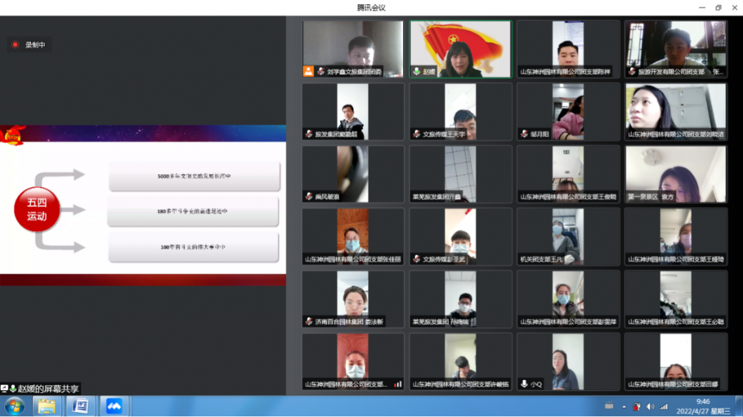 為持續深化黨的百年奮斗重大成就和歷史經(jīng)驗學(xué)習教育,引導團員青年深刻感悟新時(shí)代黨和國家事業(yè)發(fā)展的偉大成就,以實(shí)際行動(dòng)迎接黨的二十大勝利召開(kāi)。4月27日上午,濟南市團校聯(lián)合文旅集團團委共同舉辦“砥礪奮進(jìn)守初心 青春獻禮二十大”團員教育“八個(gè)一”系列活動(dòng)第一場(chǎng)線(xiàn)上培訓?;顒?dòng)由文旅集團團委書(shū)記劉翔宇主持,文旅集團團員干部及團員青年共計136人通過(guò)線(xiàn)上或線(xiàn)下學(xué)習等形式參加了此次培訓,集團團委近期將本次錄播課程以支部為單位分7批次推廣學(xué)習,計劃培訓集團團員青年200余人次。