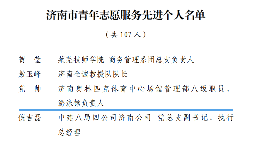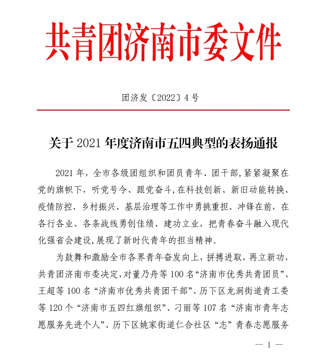 近日,共青團濟南市委公布了《關(guān)于2021年度濟南市五四出彩典型的表?yè)P通報》,集團團委所屬團組織及團員青年榮獲“濟南市五四紅旗團組織”“濟南市青年志愿服務(wù)先進(jìn)集體”“濟南市青年志愿服務(wù)先進(jìn)個(gè)人”“濟南市優(yōu)秀共青團員”“濟南市優(yōu)秀共青團干部”等5項榮譽(yù)稱(chēng)號。
