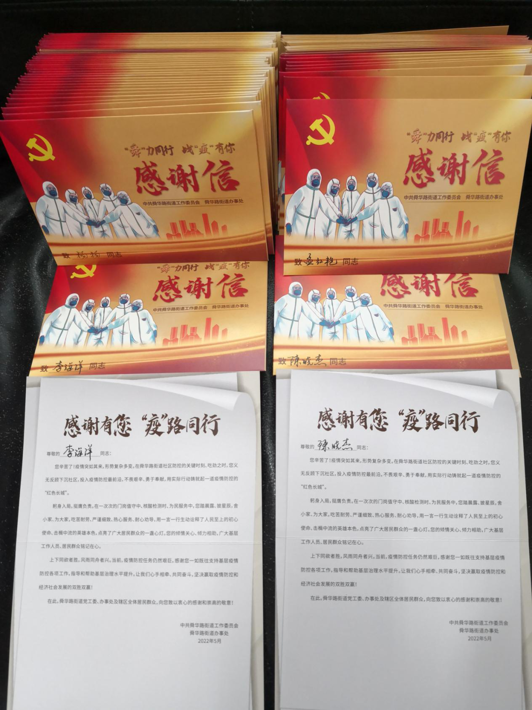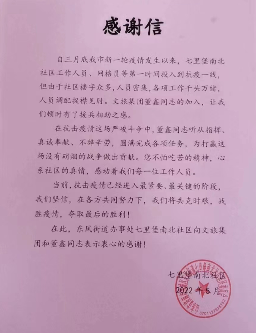 志愿者們在辛勤付出的同時(shí),也收獲了來(lái)自下沉社區的贊揚與感謝??锷浇值例堯v國際花園社區為服務(wù)隊送來(lái)了錦旗,并專(zhuān)門(mén)發(fā)表題為《“文”令而動(dòng),“旅”職擔當”》的文章,東風(fēng)街道七里堡南北社區送來(lái)了感謝信......這點(diǎn)點(diǎn)滴滴表達對文旅集團和會(huì )展防疫志愿服務(wù)隊工作的高度認可,必將為即將到來(lái)的會(huì )展旺季儲備提升旺盛的團隊士氣。