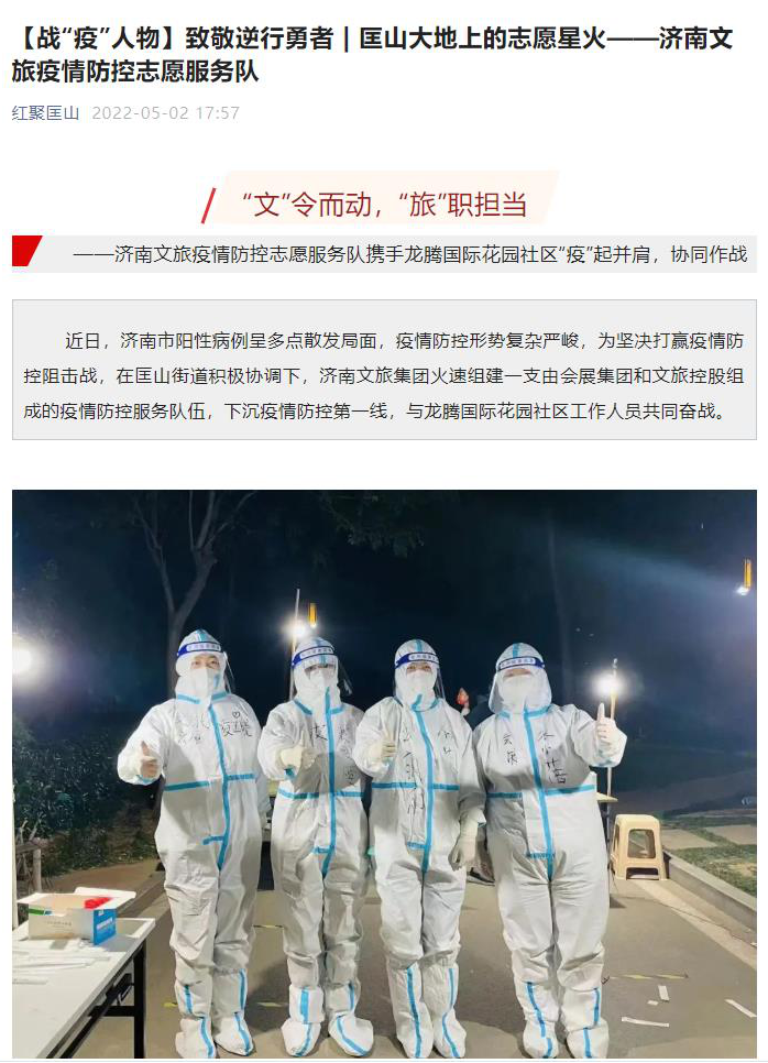 在這一場(chǎng)沒(méi)有硝煙的“戰爭”中,文旅人用自己的行動(dòng)詮釋了責任和擔當,換來(lái)了城市的溫暖和安然,也獲得了屬于自己的肯定與激勵。下沉工作雖然結束了,但為人民服務(wù)不會(huì )停止。接下來(lái),濟南文旅集團將繼續發(fā)揚沖鋒在前、團結協(xié)作、講擔當講奉獻的國企精神,為不斷推動(dòng)“活力文旅”建設和文旅產(chǎn)業(yè)高質(zhì)量發(fā)展繼續奮斗!