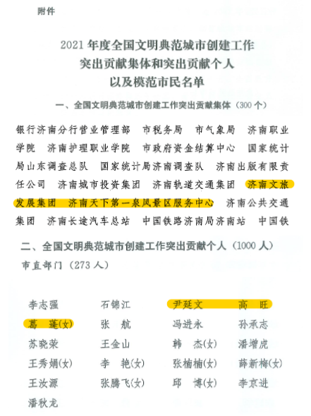 近日,中共濟南市委和濟南市人民政府下發(fā)了《關(guān)于表?yè)P2021年度全國文明典范城市創(chuàng )建工作突出貢獻集體和突出貢獻個(gè)人以及模范市民的決定》。濟南文旅發(fā)展集團及濟南天下第一泉風(fēng)景區服務(wù)中心獲濟南市2021年度全國文明典范城市創(chuàng )建工作突出貢獻集體,尹延文(濟南天下第一泉風(fēng)景區服務(wù)中心)、高旺(濟南文旅集團旅游開(kāi)發(fā)有限公司)及葛蓬(濟南奧林匹克體育中心)獲突出貢獻個(gè)人。