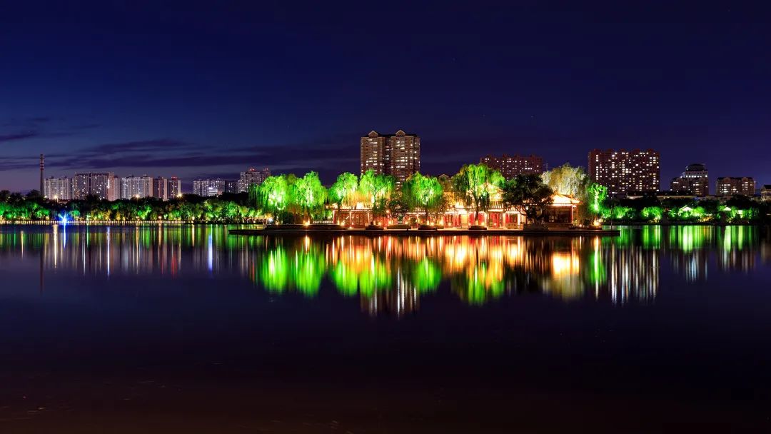 沿湖一帶成排的大樹(shù)在照樹(shù)燈的照耀下