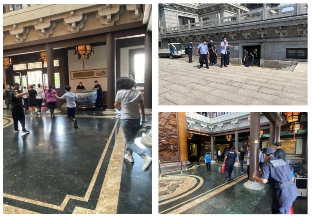 超然樓消防應急疏散演練從實(shí)戰出發(fā),由超然樓班組長(cháng)邢娟按照應急預案組織班組人員(物業(yè)人員)處置控制火情、疏散游客,安??坡?tīng)令而動(dòng)、火速增援,撲滅火情、警戒現場(chǎng)。整個(gè)演練過(guò)程清晰順暢、措施完善、處置得當。