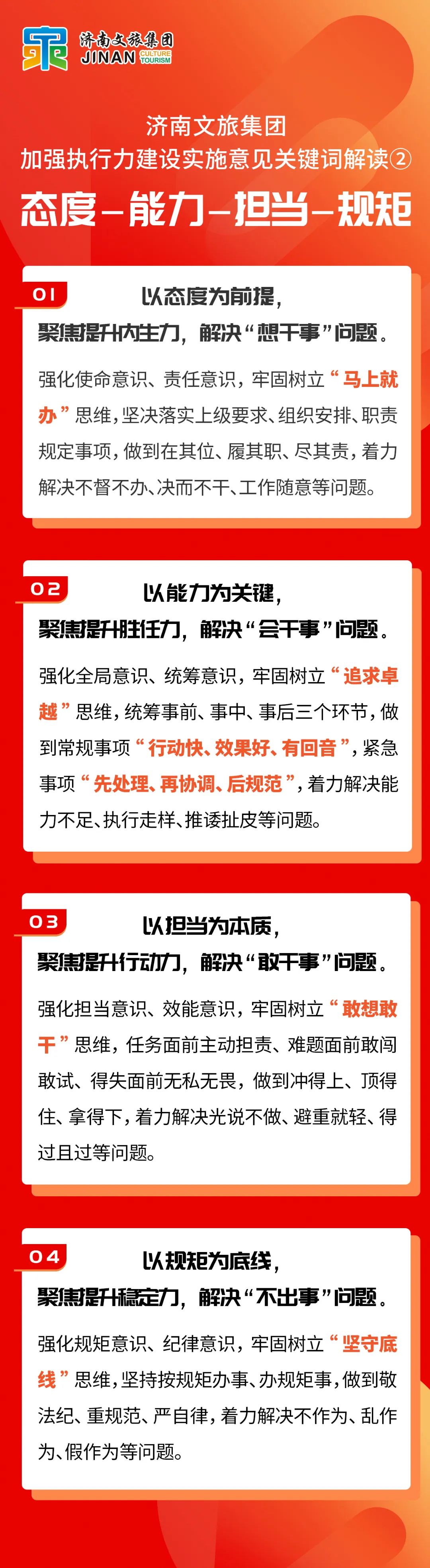 濟南文旅集團印發(fā)《關(guān)于加強執行力建設的實(shí)施意見(jiàn)》(以下簡(jiǎn)稱(chēng)《意見(jiàn)》),進(jìn)一步提升工作效能,確保集團政令暢通、令行禁止,強力推動(dòng)各項決策部署高質(zhì)高效、從快從優(yōu)落實(shí),加快打造“國際知名、國內一流的活力文旅”,今天就《意見(jiàn)》中的關(guān)鍵詞“態(tài)度-能力-擔當-規矩”進(jìn)行解讀。