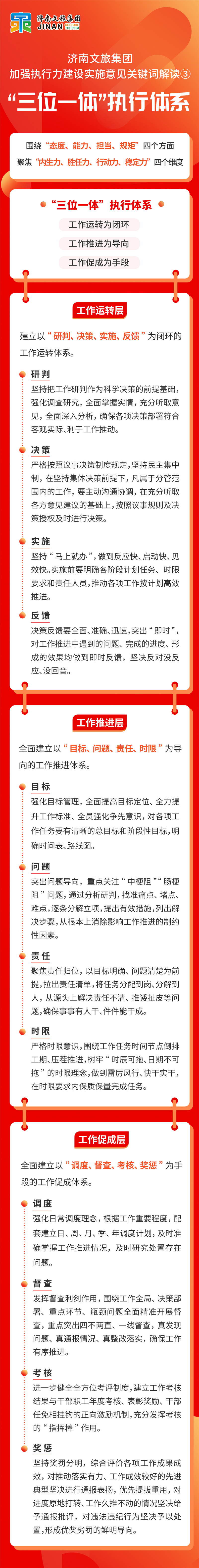 濟南文旅集團印發(fā)《關(guān)于加強執行力建設的實(shí)施意見(jiàn)》(以下簡(jiǎn)稱(chēng)《意見(jiàn)》),進(jìn)一步提升工作效能,確保集團政令暢通、令行禁止,強力推動(dòng)各項決策部署高質(zhì)高效、從快從優(yōu)落實(shí),加快打造“國際知名、國內一流的活力文旅”,今天就《意見(jiàn)》中的關(guān)鍵詞“三位一體”執行體系進(jìn)行解讀。
