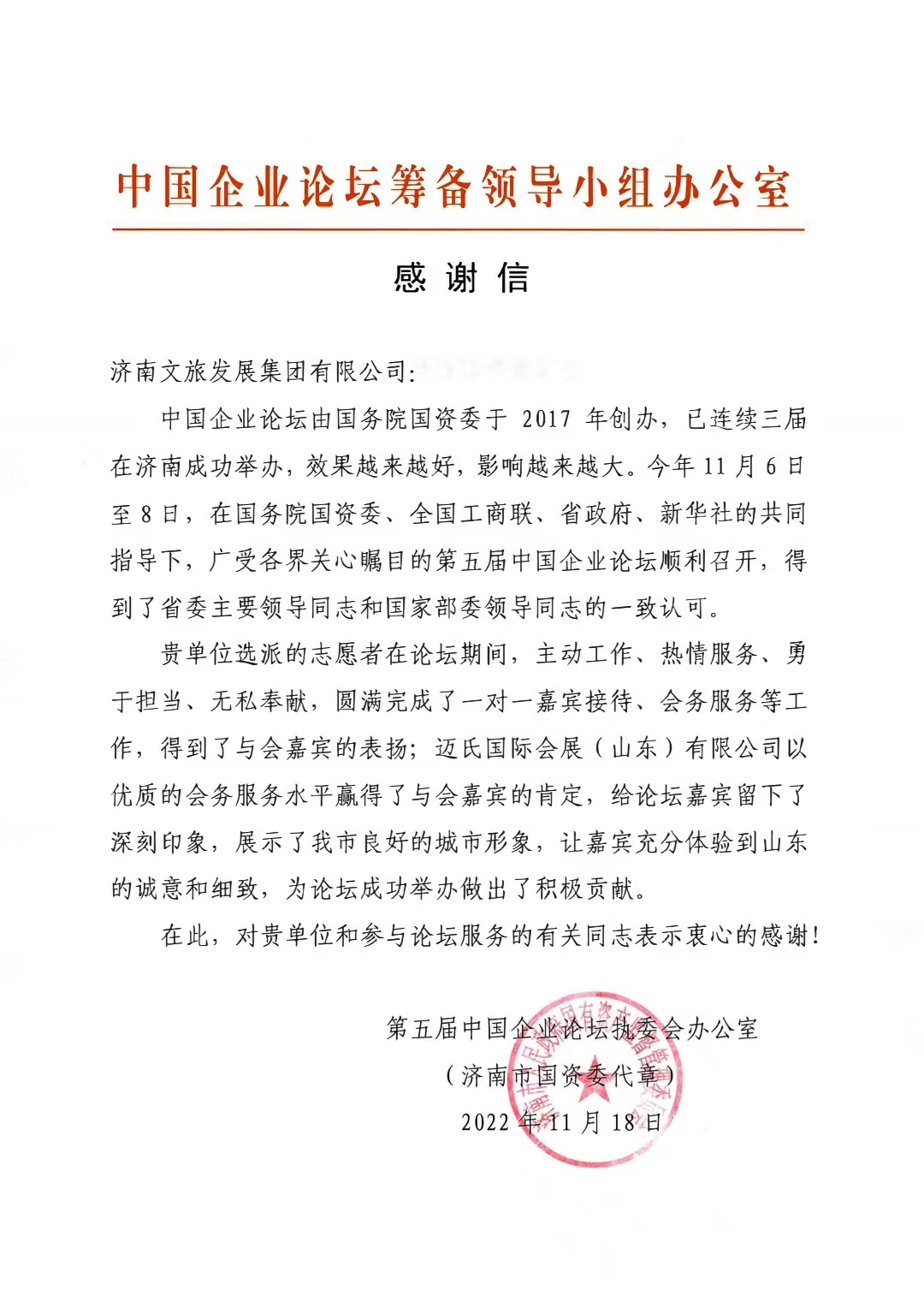濟南文旅集團選派的志愿者在論壇期間優(yōu)秀的工作能力獲得與會(huì )嘉賓的贊揚,集團旗下邁氏國際會(huì )展(山東)有限公司優(yōu)質(zhì)的會(huì )務(wù)服務(wù)水平贏(yíng)得與會(huì )嘉賓的肯定。第五屆中國企業(yè)論壇執委會(huì )特此發(fā)來(lái)感謝信,全文如下: