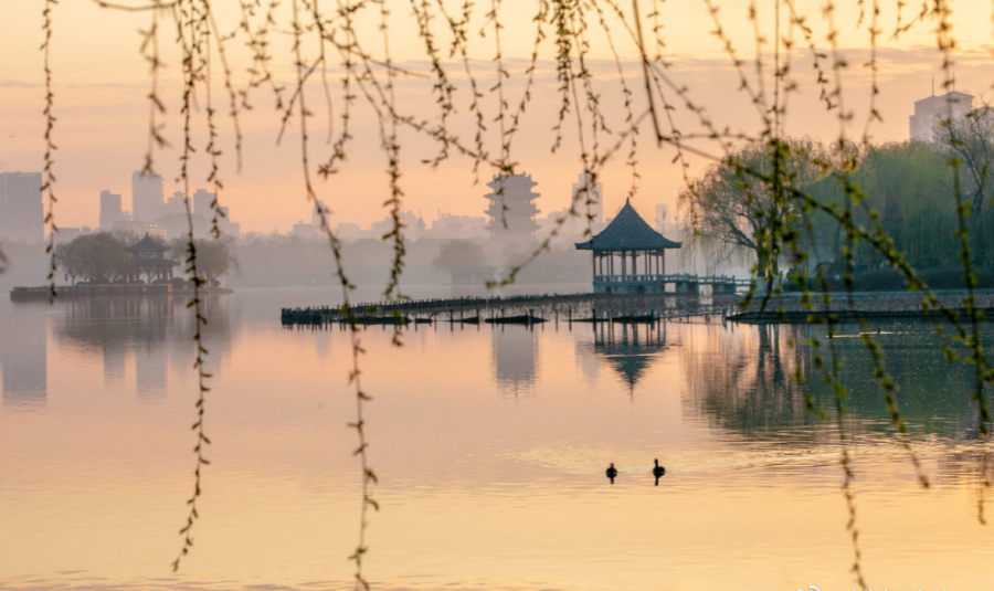 初染新綠的柳枝隨著(zhù)春風(fēng)蕩漾