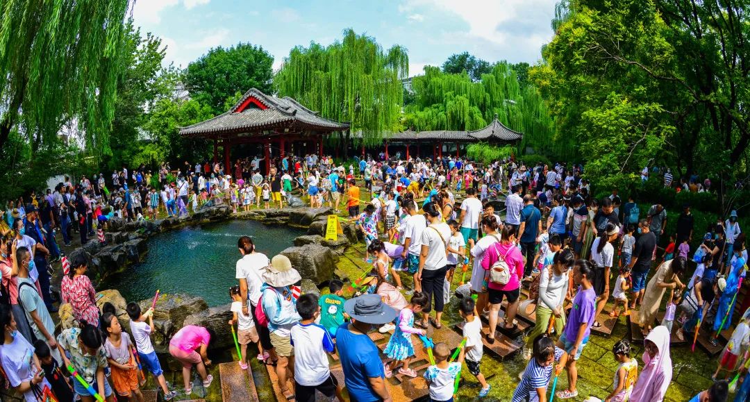 上千處泉眼汩汩流淌,尋泉、親泉、戲泉是夏天濟南人特有的消暑方式。五龍潭公園是最受濟南人歡迎的戲水寶地之一,綠樹(shù)濃蔭下,18℃的泉水流淌在青石上,大人孩子們踩進(jìn)清泉之中呲水槍、打水戰,水花飛濺,歡笑聲一片。