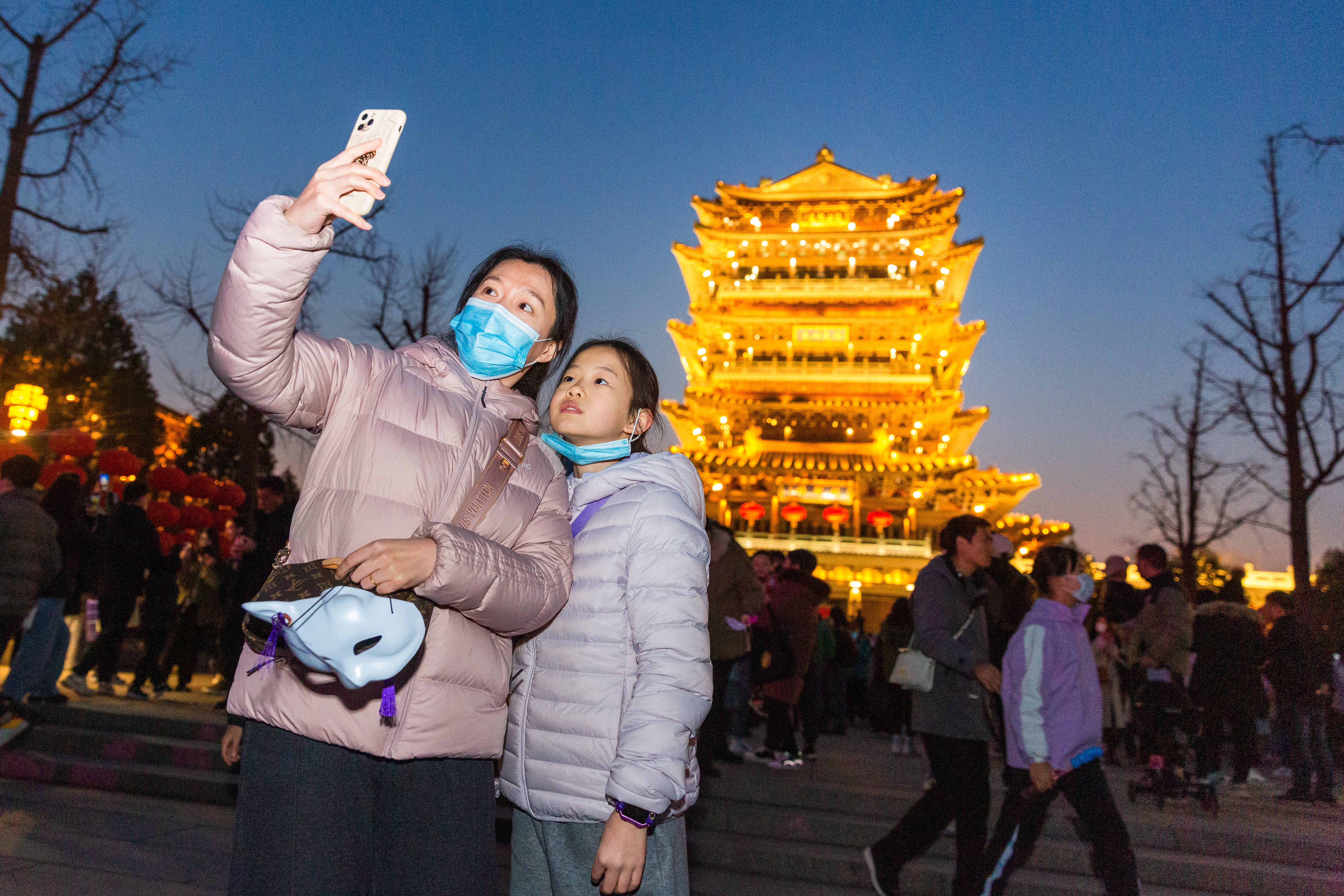 超然樓亮燈被追捧的人群拉滿(mǎn)了儀式感:人群里的手機對準了即將亮燈的樓體,傍晚的廣場(chǎng)像被手機屏幕的光亮排成的矩陣,大有熱播電視劇《三體》里人體陣列計算機的感覺(jué)。當時(shí)間如約而至,樓體依次披滿(mǎn)黃光,繼而斗拱處燈盞閃亮,從燈光勾勒的檐角分明,到瞬間通體金碧輝煌。在一片“哇”的驚呼聲中,超然樓被點(diǎn)亮了。