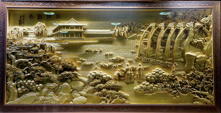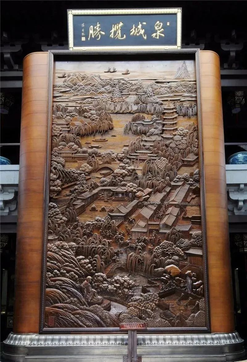 一進(jìn)門(mén),抬望眼,高堂正中間是一幅木雕巨制,名曰《泉城攬勝》。作品高8米,寬4.9米,由楠木雕刻而成,邊框用的是紅花梨,表面涂亞光漆。作品采用鏤空雕、深浮雕、淺浮雕、立體雕(人物)等傳統工藝手法,質(zhì)樸渾厚,層次豐富,色澤淡雅。作品規格之大,雕刻工藝之高,在國內屈指可數。