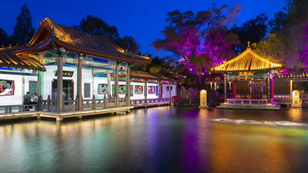 為了給市民游客提供更好的體驗感,趵突泉公園等方面也在不斷探索泉水夜游新玩法。濟南文旅集團旅游開(kāi)發(fā)公司營(yíng)銷(xiāo)部部長(cháng)宋海鵬介紹,公園內的皇華軒、望鶴亭、濼湄樓、濼苑、皇華苑、北門(mén)服務(wù)部營(yíng)業(yè)時(shí)間同步延時(shí),游客夜晚入園后,除了可以打卡流光溢彩的“三股水”,還可以走進(jìn)泉畔的望鶴亭茶社品茗聽(tīng)泉,或者嘗一嘗趵突泉文創(chuàng )雪糕、感受一下濟南民俗文化,“護城河游船項目以趵突泉景區為核心,推出了趵突泉-解放閣、趵突泉-超然樓兩條新路線(xiàn),游客在夜探‘趵突騰空’勝景后,可以從趵突泉北游船碼頭登船,前往解放閣或者超然樓繼續游玩”。