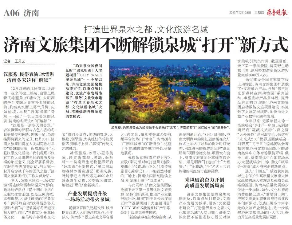 2023年12月28日,《齊魯晚報》刊發(fā)《打造世界泉水之都、文化旅游名城,濟南文旅集團不斷解鎖泉城“打開(kāi)”新方式》的文章,采寫(xiě)記者為王貝藝。文章寫(xiě)到,濟南文旅集團聚焦功能定位,以重點(diǎn)項目建設、文旅產(chǎn)業(yè)發(fā)展為抓手,服務(wù)“文化強市建設”“打造世界泉水之都、文化旅游名城”大局,不斷煥新升級游覽消費模式。如下為稿件詳情——