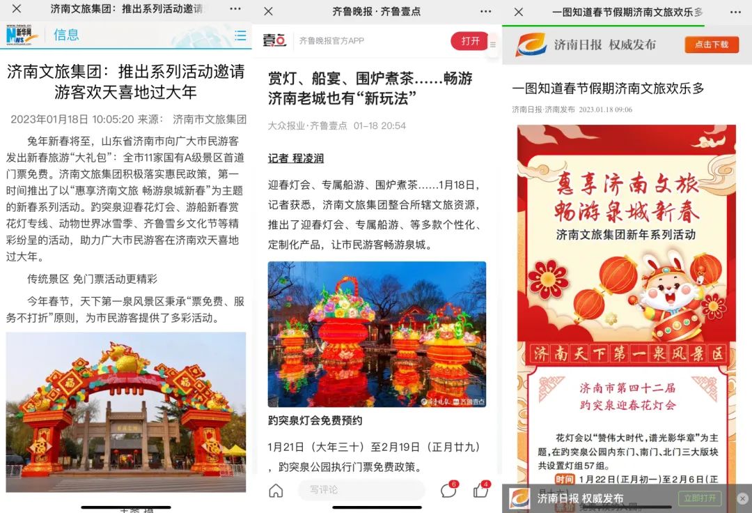 多重因素激勵下,今年春節假期,濟南文旅集團充分利用自身優(yōu)勢資源,推出形式多樣的假期活動(dòng),營(yíng)造熱烈的節日氣氛,不斷豐富市民及游客的文化體驗,讓廣大市民游客在春節期間領(lǐng)略泉城文化魅力。期間,新華網(wǎng)、大眾網(wǎng)、齊魯晚報·齊魯壹點(diǎn)、山東商報、山東廣播電視臺、閃電新聞、濟南日報、濟南時(shí)報、濟南廣播電視臺、愛(ài)濟南客戶(hù)端、天下泉城客戶(hù)端等省市重點(diǎn)電視、廣播、報紙、網(wǎng)站、客戶(hù)端平臺相繼報道。同時(shí),集團旗下天下第一泉景區和濟南野生動(dòng)物世界連續多次進(jìn)入山東“追景指數”旅游熱榜榜單。