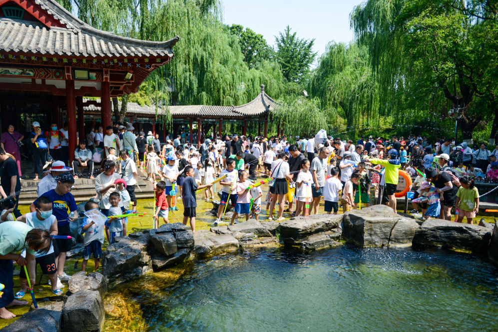 端午假期,濟南高溫持續,部分區域最高溫在40℃以上。連續高溫天氣催熱泉水游,清涼避暑游熱度不斷攀升。各大泉群周邊都聚集了眾多游客,大家紛紛來(lái)到泉畔避暑納涼,趵突泉公園、五龍潭公園等公園景區的戲水區域格外熱鬧,孩子們還上演了“水槍大戰”。