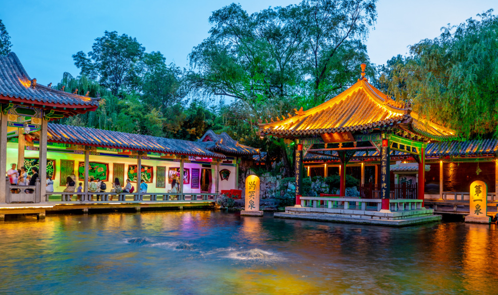 高溫天氣,令傍晚及夜間外出活動(dòng)成為不少市民游客的首選。趵突泉景區延遲閉園到9點(diǎn),許多市民游客專(zhuān)程前來(lái)打卡“夜趵突”。園內五彩斑斕的燈光與汩汩作響的趵突泉和曲徑通幽的園林風(fēng)情,讓人流連忘返,在這里既可以用心感受“波濤聲震大明湖”的奇妙,還可以走進(jìn)泉畔的望鶴亭茶社點(diǎn)一杯泉水泡茶,臨泉而坐,靜享品茗聽(tīng)泉,或者嘗一嘗趵突泉文創(chuàng )雪糕,享受泉畔和雪糕帶來(lái)的“雙重清涼”。