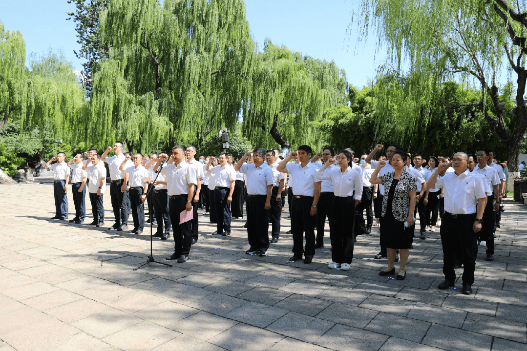走出紀念館,全體黨員干部來(lái)到美銘廣場(chǎng),瞻仰了王盡美、鄧恩銘紀念雕像。隨后,大家舉起右拳,面向鮮紅的黨旗莊嚴宣誓,重溫入黨誓詞?;顒?dòng)由集團黨委副書(shū)記、總經(jīng)理白冰同志領(lǐng)誓。