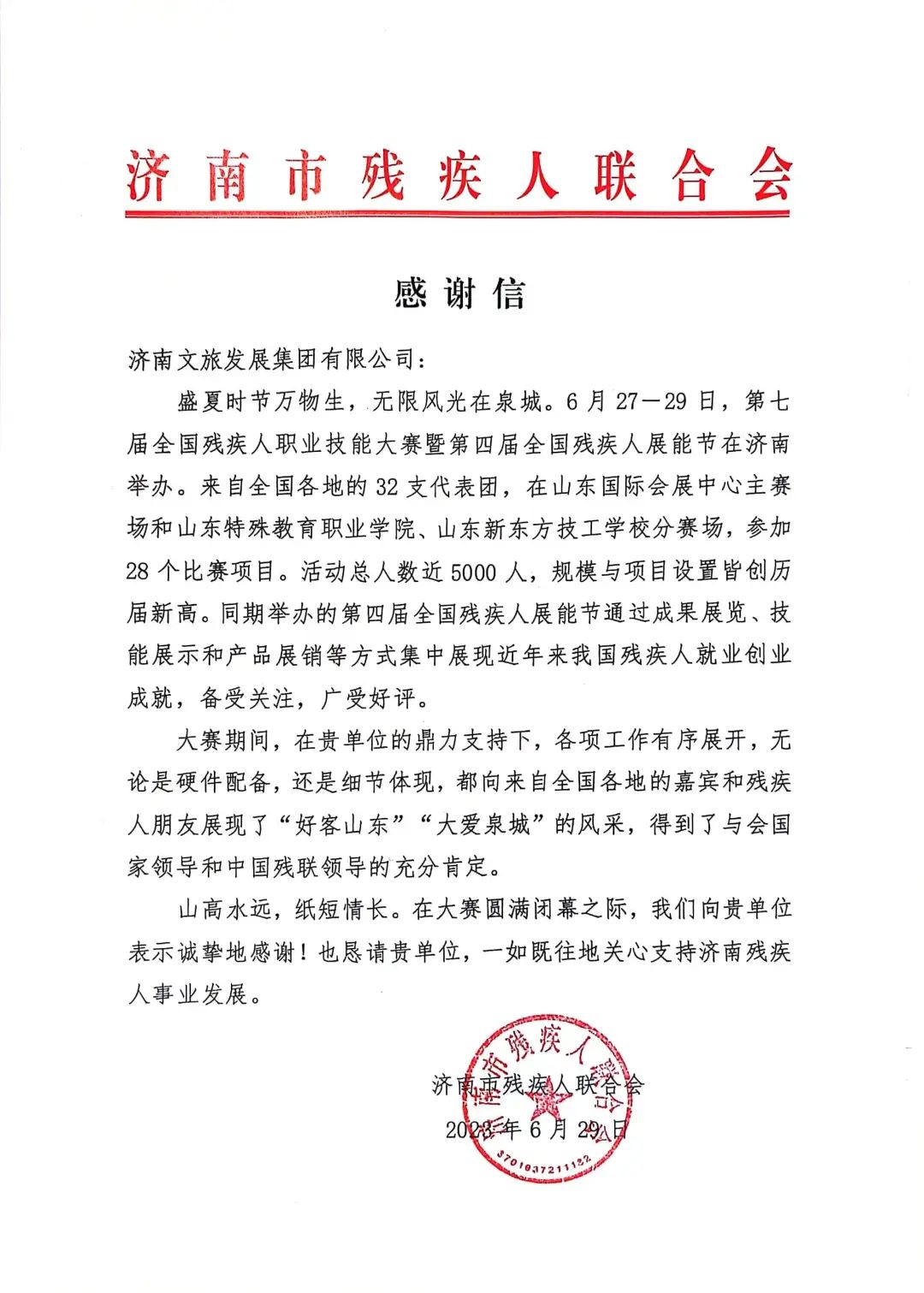 近日,濟南市殘疾人聯(lián)合會(huì )向濟南文旅集團發(fā)來(lái)感謝信,感謝信稱(chēng):6月27一29日,第七屆全國殘疾人職業(yè)技能大賽暨第四屆全國殘疾人展能節在濟南舉辦。在貴單位的鼎力支持下,各項工作有序展開(kāi),得到了與會(huì )國家領(lǐng)導和中國殘聯(lián)領(lǐng)導的充分肯定。在大賽圓滿(mǎn)閉幕之際,我們向貴單位表示誠摯地感謝!也懇請責單位,一如既往地關(guān)心支持濟南殘疾人事業(yè)發(fā)展。