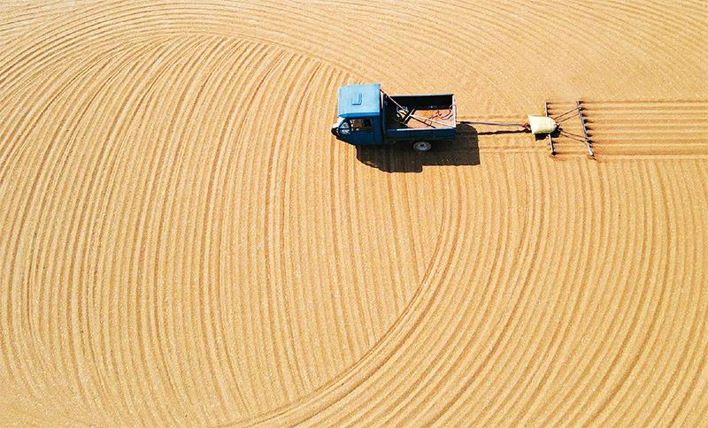 6月,正值小麥集中收獲時(shí)節,各地農民搶抓晴好天氣忙著(zhù)收割、晾曬小麥,確保小麥顆粒歸倉。圖為2023年6月9日,在江蘇省如皋市糧食儲備有限公司曬糧場(chǎng)上,工作人員用機械翻曬入庫的小麥。新華社發(fā) 吳樹(shù)建/攝