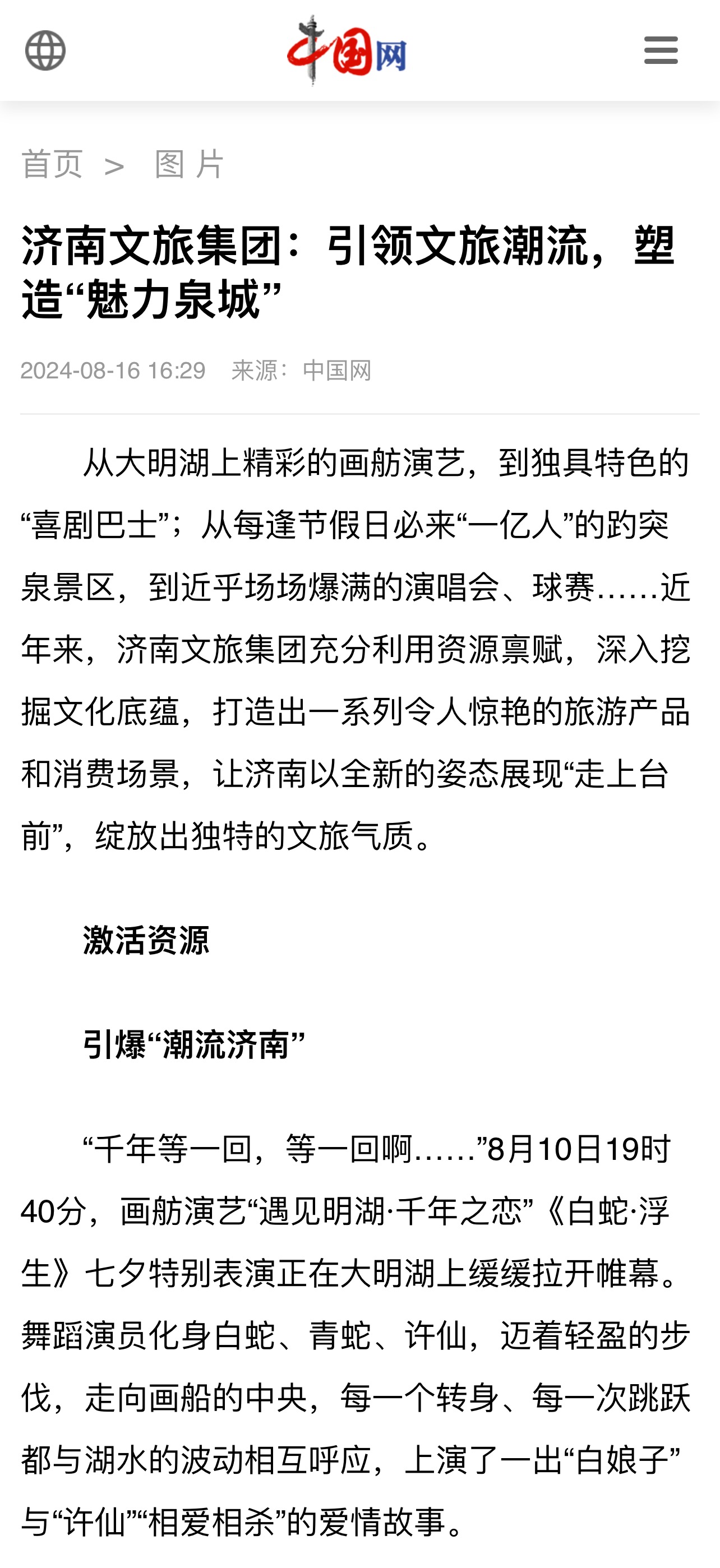 近日,《中國網(wǎng)》聚焦濟南文旅集團,以《濟南文旅集團:引領(lǐng)文旅潮流 塑造“魅力泉城”》為題,對集團挖掘文化底蘊,打造出一系列旅游產(chǎn)品和消費場(chǎng)景的經(jīng)驗做法予以宣傳報道,人民日報社中國經(jīng)濟周刊官網(wǎng)等媒體紛紛轉載。文章寫(xiě)到:近年來(lái),濟南文旅集團充分利用資源稟賦,深入挖掘文化底蘊,打造出一系列令人驚艷的旅游產(chǎn)品和消費場(chǎng)景,讓濟南以全新的姿態(tài)展現“走上臺前”,綻放出獨特的文旅氣質(zhì)。如下為稿件詳情——