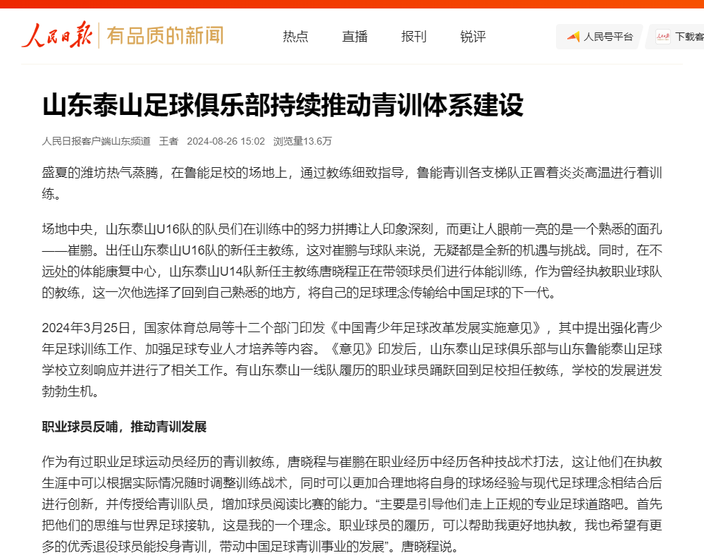 近日,人民日報客戶(hù)端山東頻道聚焦山東泰山足球俱樂(lè )部青訓體系建設,以《山東泰山足球俱樂(lè )部持續推動(dòng)青訓體系建設》為題,對山東泰山足球俱樂(lè )部與山東魯能泰山足球學(xué)校持續實(shí)施“高度一體化戰略”,打造高質(zhì)量教練員梯隊人才培養閉環(huán)的經(jīng)驗做法予以宣傳報道。如下為稿件詳情——