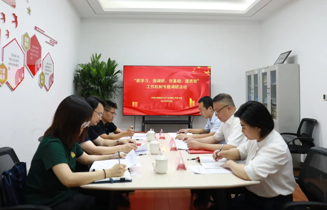 8月8日下午,濟南文旅集團黨委委員、副總經(jīng)理王鋒帶隊赴濟南文旅國際文化產(chǎn)業(yè)有限公司開(kāi)展“抓學(xué)習、強調研、夯基礎、提質(zhì)效” 工作機制專(zhuān)題調研,公司黨支部書(shū)記、董事長(cháng)雷凱及支委會(huì )成員參加調研。